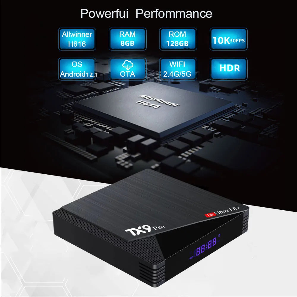 TX9 Pro është një Android TV Box i gjeneratës së re, që e kthen çdo televizor në një qendër argëtimi inteligjente. Me procesor të fuqishëm Quad-Core, 8 GB RAM, 128 GB hapësirë ruajtjeje dhe sistem operativ Android 12.1, ky smartbox ofron përvojë të shpejtë, imazh ultra të qartë dhe performancë të qëndrueshme për filma, video, lojëra dhe aplikacione streaming.
