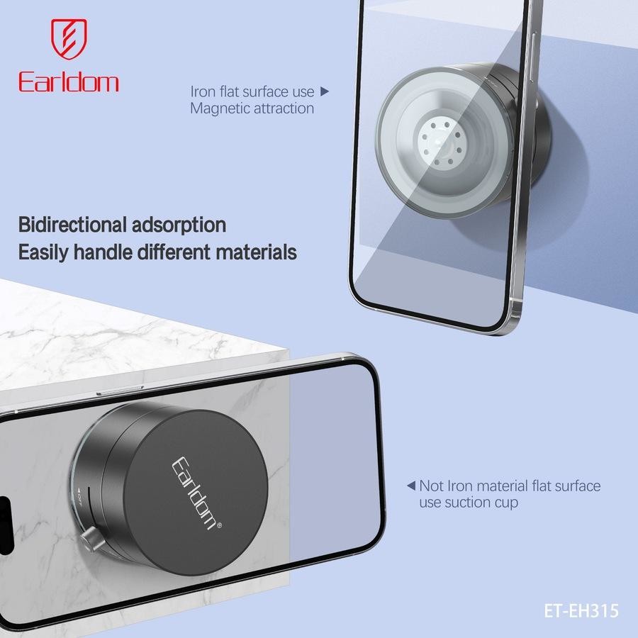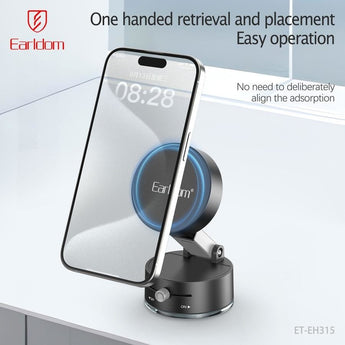 Earldom EH315 është një mbajtës celular për makinë që kombinon sistemin e kapjes me vakum dhe magnetin e fortë për të siguruar që celulari të mbetet pa rrëshqitje edhe në rrugë të lëkundura. Ai është dizajnuar për t’u ngjitur në xham, metal ose sipërfaqe të lëmuara dhe ofron rotacion 360° për pozicione ideale gjatë përdorimit si GPS apo për video. Materialet e tij të forta dhe shtresa e butë mbrojnë telefonin nga gërvishtjet.