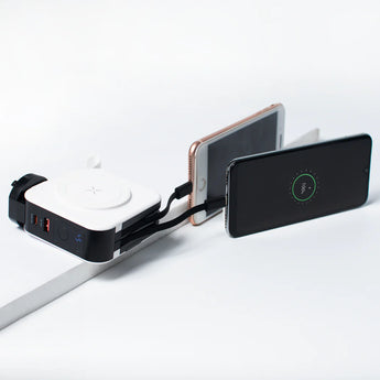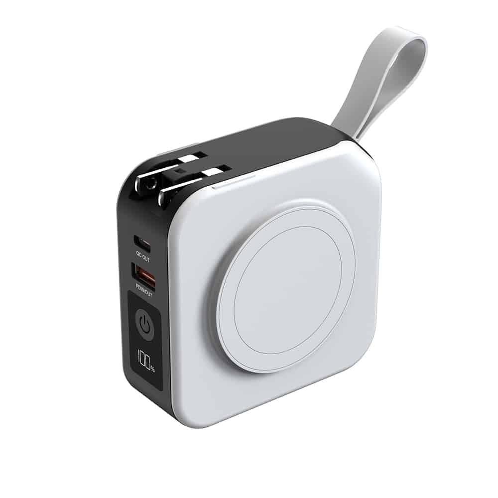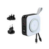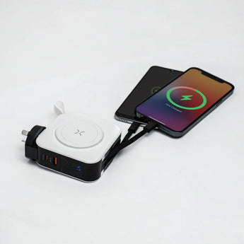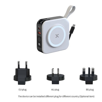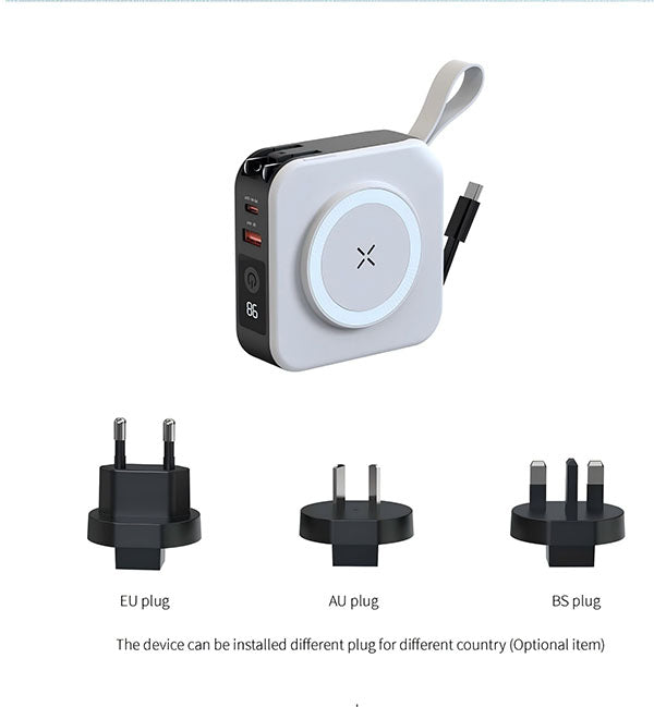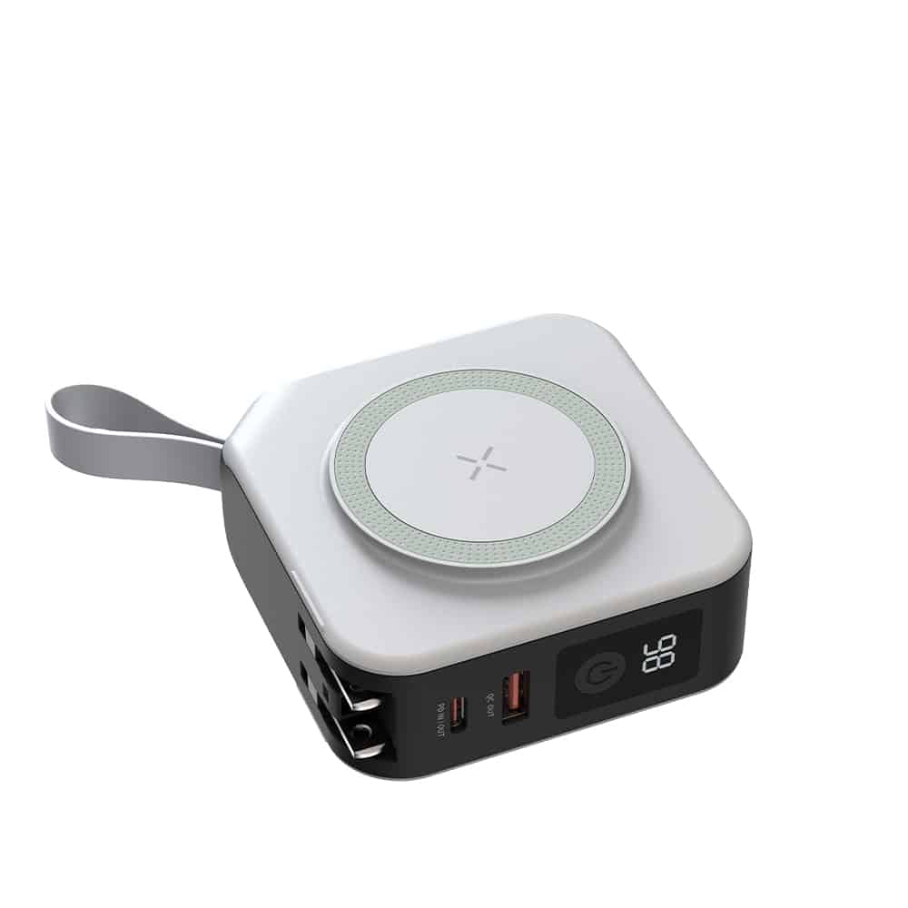 Powerbank multifunksional EU/US/AU – 10.000 mAh, me 2 kabllo te integruara, wireless
