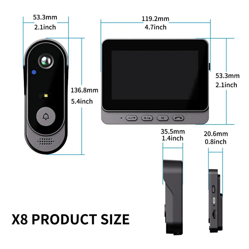 X8 është një zilë inteligjente me monitor të integruar, e dizajnuar për siguri dhe komoditet në shtëpi apo zyrë, pa pasur nevojë për lidhje WiFi. Pajisja funksionon në mënyrë të pavarur, me bateri të integruar, duke ofruar pamje dhe komunikim direkt me vizitorët përmes ekranit të brendshëm.