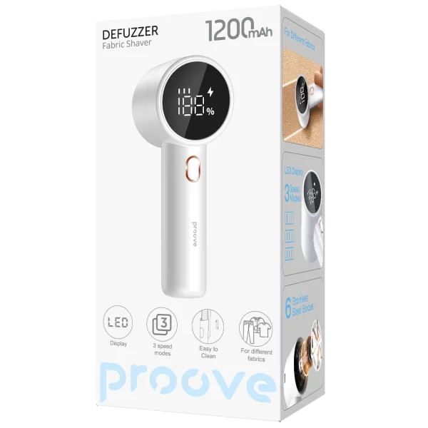 Proove Fabric Shaver Defuzzer është një pajisje elektrike për heqjen e qimeve, gungave dhe fijëve të tepërta nga rrobat, duke i bërë ato të duken sërish si të reja. Me tehe çeliku inox, motor të fuqishëm me rrotullim të shpejtë dhe bateri të integruar të rikarikueshme, kjo pajisje është zgjidhja perfekte për kujdesin e përditshëm të veshjeve.