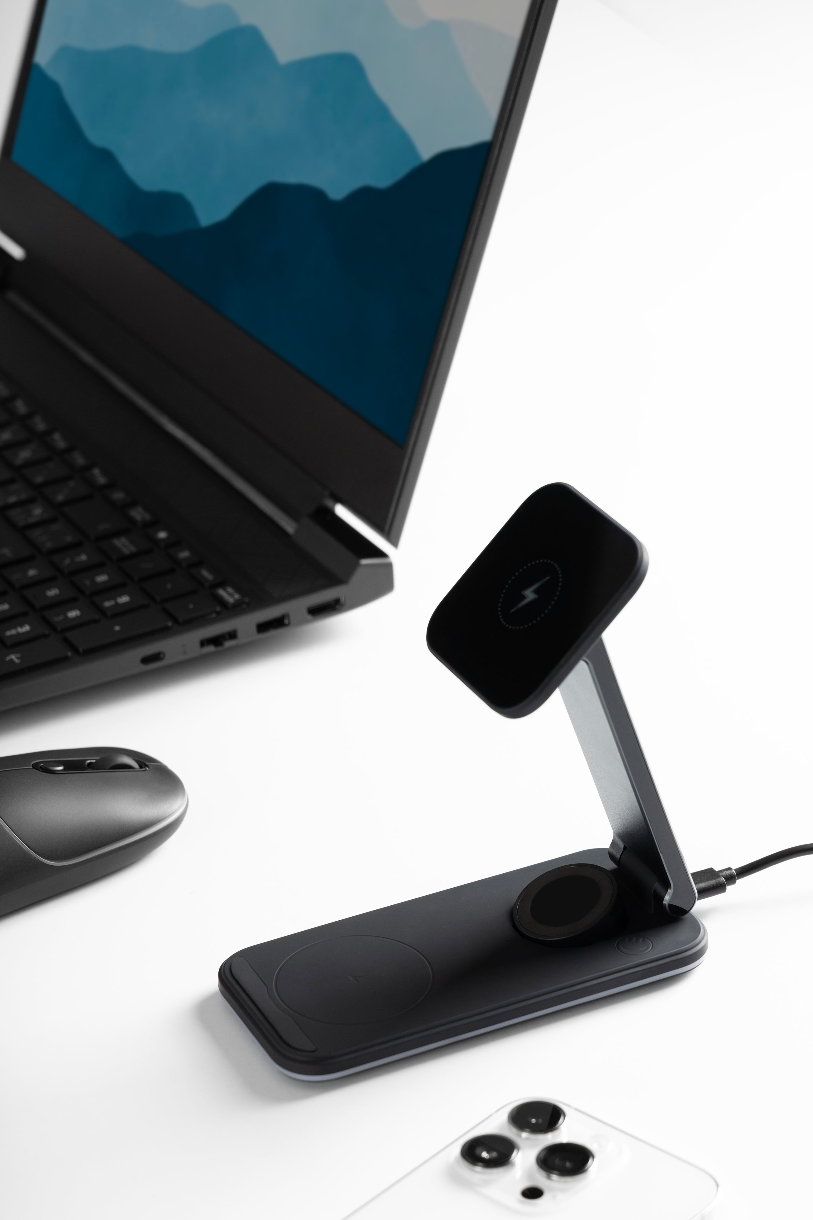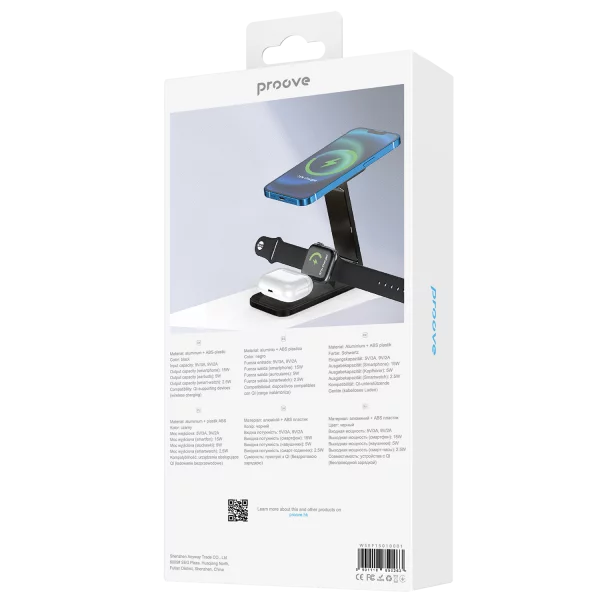 Karikuesi wireless 3 në 1 Proove Energy është zgjidhje praktike për karikim të njëkohshëm të smartphone-it, kufjeve wireless dhe orës inteligjente. Me fuqi maksimale 15W dhe mbështetje për standardin Qi, ofron karikim të qëndrueshëm dhe të sigurt për pajisje kompatibile. Dizajni kompakt me kombinim ABS dhe aliazh alumini e bën të përshtatshëm për tavolinë pune ose komodinë.