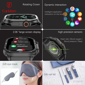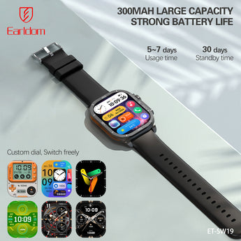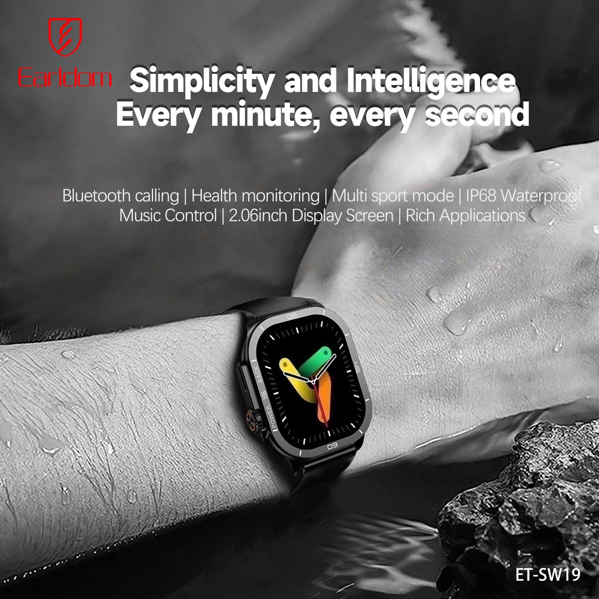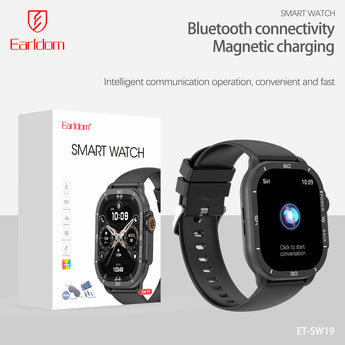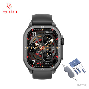 Earldom ET-SW19 është një orë inteligjente moderne me ekran 2.01 inç HD, e dizajnuar për përdorim të përditshëm dhe aktivitete sportive. Ajo ofron funksione si thirrje me Bluetooth, matje të rrahjeve të zemrës, presionit të gjakut, oksigjenit në gjak (SpO₂) dhe monitorim të gjumit. Me dizajn elegant, trup metalik dhe klasifikim IP67 rezistent ndaj ujit dhe pluhurit, kjo orë përputhet me çdo stil jetese.